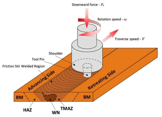 Friction stir welding, as a solid-state process, is based on the plastic deformation of joined materials, elicited by using a special tool consisting in general of a shoulder and a mixing pin (Figure 1). The basic function of this tool is to generate heat, which enables the plasticisation of the materials, and then their mixing. Around the FSW joint, as shown in Figure 1, three characteristic zones within which the material properties have changed in relation to the base material (BM) are generally specified. These zones are: (i) the heat affected zone (HAZ), (ii) the thermo-mechanically affected zone (TMAZ) and (iii) the weld nugget (WN), where the material is fully recrystallized [1]. In addition, due to the complex motion of the working tool, there are two distinctive sides of the formed joint: the advancing side—where the tangential vector of the rotational speed of the tool is compatible with its travel speed vector, and the retreating side—where the senses of mentioned vectors are opposite (Figure 1).