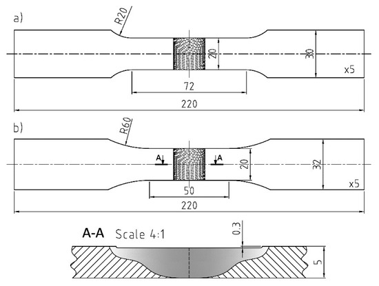 Base material samples and FSW butt joints were fabricated from 5 mm thick plates of high purity electrolytic copper (Cu-ETP R220) with a chemical composition containing more than 99.9% Cu, according to the EN 573-1 standard. The FSW welds were performed on a conventional Jafo CNC milling machine at a constant rotation speed ω = 580 rpm and at three different traverse speeds: V = 40, 60 and 80 mm/min. The other FSW parameters were zero tilt angle, plunged depth of 0.3 mm, tool plunging speed of 2.5 mm/min and dwelling time of 5 s. The dimensions of the plate welded in such a way were approximately 300 mm × 300 mm. A view of the tool geometry used for welding and a representative example of the weld are presented in Figure 2. Samples from base material and welded plates for static and fatigue tests, with geometry shown in Figure 3, were cut out using the water-jet technique. The good quality (defect-free) of the FSW joints produced in accordance with the above parameters was confirmed by visual observation and ultrasonic evaluation.