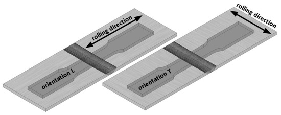 For FSW joints, the welds were located in the centre of the samples as presented in Figure 3. Specimens, both from the base material and from welded plates, were made for two sheet configurations, i.e., longitudinally (orientation L) and transversally (orientation T) to the direction of their rolling process, as presented schematically in Figure 4. The test plan was additionally extended by tensile tests of specimens subjected to earlier annealing at 600 °C. These results were considered as a reference point for the assessment of weld strength properties in the heat affected zone (HAZ). The annealing temperature was adopted based on temperature maps, as presented in Figure 5, registered by the thermal imaging camera on the surface of sheets during the welding process in the tool working area. Although the temporary weld temperature (T) just behind the rotating shoulder was about 800 °C, it stabilised a short distance from the tool at 600 °C.