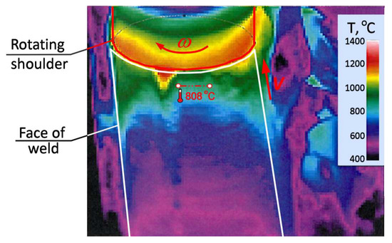 The temperature field (T) registered during FSW process by a thermal imaging camera on the copper plate surface behind the tool.