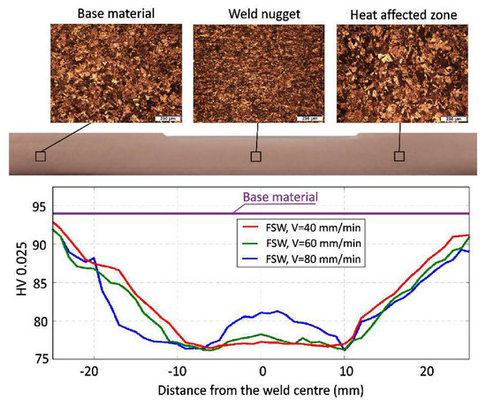 The microhardness distribution determined for the various traverse speeds on the cross-section of the joints along the centre of the specimens’ thickness is presented in Figure 6.