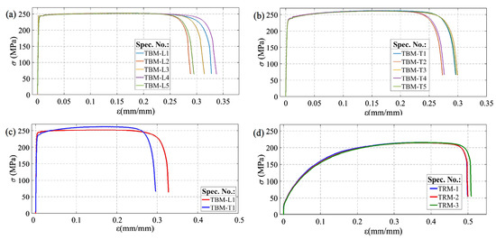 As presented in Figure 7, the strength properties of solid sheets for the given orientation (L and T) were characterised by high repeatability, apart from a few percent spread of the strain at failure. Samples loaded along the rolling direction (TBM-L) above the elastic strain range showed almost perfectly plastic characteristics (Figure 7a). Comparison of the tensile curves for both orientations (Figure 7c) demonstrate that the strain at failure was slightly higher in the case of loading in accordance with the rolling direction of the sheet. In the transversal direction (specimen TBM-T, Figure 7c), where a slight strengthening effect was observed, the yield stress was lower by about 4% and the ultimate tensile strength was higher by about 3%, compared to longitudinal orientation (Table 2). The recrystalising annealing at 600 °C (specimens TRM, Figure 7d) caused a seven-fold decrease in yield stress and a decrease of about 17% in ultimate strength, with a simultaneous increase in strain at failure by close to 60%, and an increase in the value of reduction of area at failure by about 2%–4% (Table 2).
