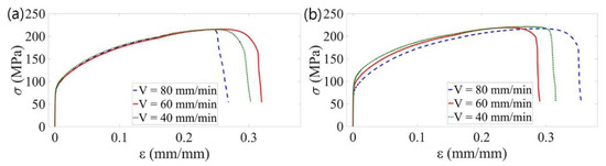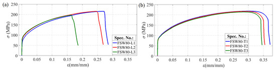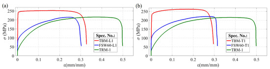 Tensile curves of FSW joint specimens produced with rotary speed ω = 580 rpm and traverse speed V = 80 mm/min: (a) orientation L; (b) orientation T.