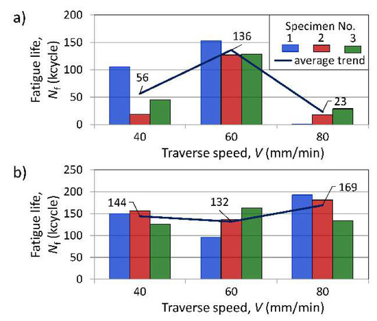Influence of traverse welding speed on fatigue life of FSW joint specimens (R = 0, ΔS = 160 MPa): (a) orientation L; (b) orientation T.