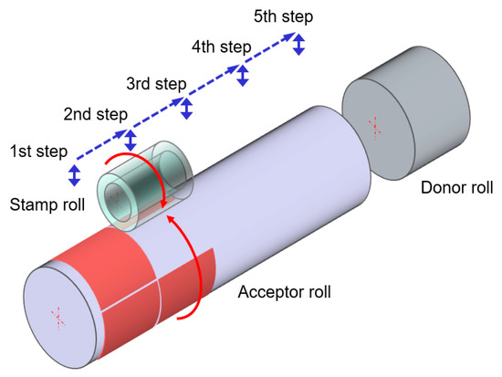 The acceptor roll is made of steel, and a 70 μm thick PET film is wrapped around it with adhesive tape. As the next step in the single process, the stamp roll was moved to a designed position of the acceptor roll. The two rolls were then pressed and synchronously rotated with a linear velocity of 0.12 mm/s, which satisfies the curing condition of the resist, as shown in Figure 6. The resist was then transferred from the stamp roll to the acceptor roll, forming an inverse shape relative to the stamp roll pattern.