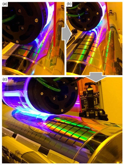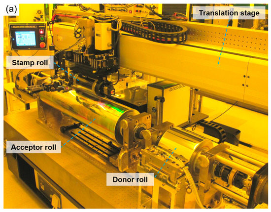 There is a stamp roll above the acceptor and donor rolls, as shown in Figure 3b. The stamp roll consists of a transparent quartz tube (Daeyang Optical Co., Daejeon, Korea) with an effective length of 200 mm. The tube has an outer diameter of 125 mm. The tube is changeable by simply separating one side of its rotational guide. Therefore, the tube can be standardized, similar to the wafer used in the flat process.