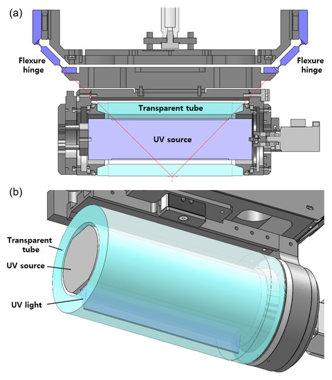 Cross section images of the stamp roll unit. (a) The passive angle compensation mechanism using flexure hinges; (b) the UV source installed inside the stamp roll (transparent tube).