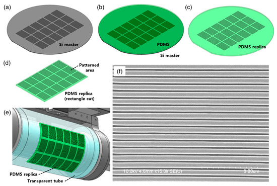 The nanopatterns can be directly fabricated on the surface of a transparent tube, or a nanopatterned film can be attached to the surface of the tube to prepare the stamp roll. For this experiment, we first fabricated a polydimethylsiloxane (PDMS) replica from a nanopatterned silicon (Si) template as shown in Figure 5a–d. The PDMS was made by mixing a 10:1 ratio of Sylgard 184 base and Sylgard 184 cure agent (Dow Corning Co., Midland, MI, USA). After the mixture was poured onto the Si template (Figure 5b), it was degassed in a vacuum desiccator for 10 min and cured at 70 °C in an oven for 5 h. The thickness and Young’s modulus of the PDMS replica were 2.5 mm and 1.48 MPa, respectively. The PDMS replica should be uniform in thickness to produce conformal contact with the acceptor roll during this process. We cut it into rectangles of 144 mm by 96 mm in size (Figure 5d) and mounted to the surface of the transparent tube. PDMS adheres well to the quartz surface, so after attaching it to the transparent tube, the edges were fixed with adhesive tape to prevent lifting. There are nanolines, as shown in Figure 5f, with a width, pitch and depth of 150, 400 and 300 nm, respectively, in the patterned area of the PDMS replica.