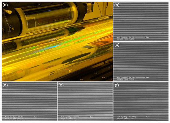 The patterned acceptor roll after the step-and-repeat process is shown in Figure 7a. The transferred nanopatterns (vertical lines) were measured via scanning electron microscopy (SEM), as shown in Figure 7b–f. Since the acceptor roll was covered with a PET film, the film was peeled off and an arbitrary position was selected to measure after the experiment. The SEM image shows that the patterns on the acceptor roll have the inverse shape of that of the PDMS replica on the stamp roll. Some of the lines have irregular pitch, which is thought to be due to the pattern being transferred while the PDMS stamp is deformed. Therefore, it is necessary to precisely adjust the parameters such as performing the process with a load as low as possible among the conditions in which the resist is cured and transferred.