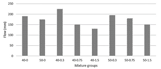 Figure 3 shows the flow values for basalt-reinforced bottom ash cement paste composites. Increasing the amount of bottom ash decreases the flow value beyond 0.3% basalt fiber. This is due to coarser particles of bottom ash. The interparticle friction hinders the movement. The addition of basalt fiber improves the flowability of the mixtures for both bottom ash mixture groups at a low volume fraction (0.3%). However, going beyond the 0.3% basalt fiber addition, the flow values in 40-0 mixture groups tend to decrease. The decrease in flow starts beyond 0.75% basalt fiber level in 50-0 mixtures. The absorption of available water, due to the large surface area of basalt fiber, caused a marginal decrease in flow values, especially beyond 0.3%. In addition, basalt fiber might absorb more cement paste at high volume fraction. However, the cohesiveness of the composites improved with the addition of basalt fiber. Similar results were found in Li et al. [43], Qin et al. [44], and Sadrmomtazi et al. [45]. Further, the composites are said to be workable if the flow values are approximately 150 mm [46]. In this study, all mixture groups except 40-1.5 mixture groups had flow values lower than 150 mm (containing 1.5% basalt fiber). However, this mixture group can also be easily cast into molds without extra workmanship. In this study, only one basalt fiber length (6 mm) was utilized. There are also 12- and 24-mm basalt fibers in length. One study performed on concrete showed that the increase in the length of basalt fiber results in a decrease in workability being more visible [47]. Based on the flow test results, all composites can be considered sustainable. It is believed that the addition of basalt fiber improves the consistency of the mix and decreases the energy requirements during casting. This could be a positive addition to basalt fibers, especially during formwork operations on-site; it also requires less workmanship. If the percentage of basalt fiber is kept at 0.3%, it will maximize the performance of the composites. Considering the 40-0.3 mixture groups, the increase in flow was calculated as 32% compared with the 40-0 mixture groups, and this increase was 11% compared with the 50-0 mixture groups. Additionally, the flow tends to decrease beyond 0.3% basalt fiber addition in 40-0 mixture groups, but this trend was beyond a 0.75% basalt fiber addition in 50-0 mixture groups. The 50-0 mixture groups show less reduction when compared with the 40-0 mixture groups. The reduction in flow at higher fiber volume fraction (1.5%) was approximately 32% for the 40-0 mixture groups and 14% for the 50-0 mixture groups. This might be due to the increments in fine material amount in 50-0 mixture groups, which contain less cement compared with that of the 40-0 mixture groups. When basalt fiber is used in large volume (1.5%), it produces greater shear resistance against the flow. Basalt fiber composed of filaments and large surface area requires more mixing water and more cement paste to coat all particles.