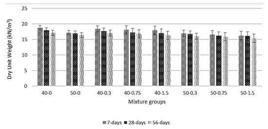 Figure 4 shows the dry unit weight (DUW) values for basalt-reinforced bottom ash cement paste composites at 7, 28, and 56 days of curing. The DUW values decrease with curing ages. The highest decrease (approx. 10%) was reported in the 40-1.5 mixture groups. The basalt fiber decreases the DUW values for both mixture groups when compared with the control sample. The average reduction for all series was about 7%. The decrease is more pronounced at high volume fractions. This might be due to the fact that, when basalt fiber is introduced into a system, it needs more paste to coat. This results in a reduction of composite density. The reduction in density may be linked to higher void content. In a homogeneous material, regardless of performed testing, the specific gravity is always constant. However, if a composite material is produced where the additive material has a lower specific gravity in comparison to the parent material, the matrix specific gravity reduces accordingly in relation to additive material content. It is a known fact that the pore structures within a matrix formed with hydration reaction. However, the decrease in DUW was higher in the higher cement amount group (40-0 series). This can also prove that more paste formation causes more reduction. The same findings can be found in [31,44]. The composites were classified as lightweight if the density is lower than 2000 kg/m3. Lightweight composites generally have good mechanical performance and superior durability. Based on the DUW values, all composites can be categorized as lightweight material; further, composites could be an alternative sustainable building material for the construction sector.