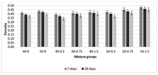 Figure 5 shows the porosity values for basalt-reinforced bottom ash cement paste composites at 7, 28, and 56 days of curing. Porosity decreases with curing ages. The rate of decrease increases beyond 28 days. This is due to the slow reaction of bottom ash particles. The addition of basalt fiber decreases the porosity at low volume fraction (0.3%). For beyond a 0.3% basalt fiber addition, the porosity values tend to increase. The compactness of the composites become less effective beyond 0.3% basalt fiber volume fraction, which can cause the formation of more voids. Additionally, basalt fiber increments require more cement paste, since the paste volume constant for all mixtures’ more porous matrix can form at high volume fractions. In addition, the decrease in the dispersion ability of fibers and cement paste can cause an increase in porosity values. The increase in water demand due to the addition of basalt fiber, especially at higher volume fraction, can be considered another factor for such an increase. At low volume fractions, the 40-0.3 and 50-0.3 mixture groups show 8% and 5% improvement at later ages, respectively. This improvement in porosity values was lower in the early curing period. This is expected due to the slower reaction of the bottom ash mixture groups. The increase in porosity was approximately 12% at early ages, which becomes 15% at later ages in 50-1.5 mixture groups. However, in 40-1.5 mixture groups, those values were 2% and 8% for early and later ages, respectively. The results are compatible with the water absorption (WA) test results. Compatible results can be found in [44,46,48,49].