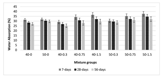 Figure 6 shows the water absorption (WA) values for basalt-reinforced bottom ash cement paste composites at 7, 28, and 56 days of curing. The WA values tend to decrease with curing age. An increase in the bottom ash amount also increases the WA values. This can be explained by the fact that the addition of basalt fiber increases the pore connection at high volume fraction. Additionally, it can be seen from the flow values that the addition of basalt fiber decreases the flow values due to a higher absorption capability of basalt-enriched mixtures. The WA values tend to increase beyond the 0.75% basalt fiber addition level for both mixture groups. However, the increase in WA values is more in 50-0 mixtures compared with 40-0 mixtures. At early ages, the 1.5% basalt fiber addition caused a 16% and 18% decrease in WA values when considering the 40-0 and 50-0 mixture groups, respectively. This is due to the fact that bottom ash particles have a higher tendency to absorb more water. The 50-0 mixture groups were composed of a higher amount of bottom ash. At later ages, both mixture groups exhibit the same behavior. Similar findings were found in [31,45].