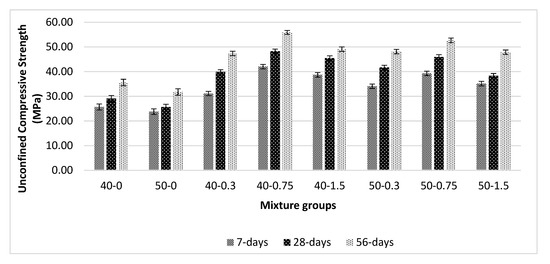 Figure 7 shows the unconfined compressive strength values for basalt-reinforced bottom ash cement paste composites at 7, 28, and 56 days of curing. The addition of basalt fiber increases compressive strength. However, this increase was diminished at beyond 0.75% basalt fiber addition. In addition, the increase in the capillary pores can cause a reduction in strength at a higher volume fraction of basalt fibers, as these fibers mostly affect the capillary porosity and not the gel porosity due to its large surface area; thus, at low volume fractions, more strength can be achieved. More gel formation via bottom ash particles in composites also helps in the increase in compressive strength. In this study, basalt fiber having 6 mm in length was used. This can also be a factor for strength increase. This length of basalt fiber seems to have better compactability and shows superior adhesion with cement paste. Similar findings are reported in [26,27,29]. The average increase from 7 to 56 days was approximately 27% for both mixture groups. The rate of increase was higher at low volume fraction. Beyond a 0.3% volume fraction of basalt fibers showed a lower rate of increase. This might be due to the weakening of the bond at high basalt fiber, increase of water absorption, and porosity of the composites. The rate of improvement in UCS was higher in the 50-0.75 mixture groups when compared with the 40-0.75 mixture groups for all curing ages. However, the 40-0.75 series showed higher strength at all ages. This is compatible with the porosity test results. When compared with the 50-0.75 mixtures, the increment in UCS was calculated as 65% at 56 days, and this was 57% for 40-0.75 mixtures at the same curing age. At a higher basalt volume fraction (1.5%), the UCS values significantly reduced by 51% at seven days for 40-1.5 series, and this reduction was 48% for the 50-1.5 series. When considering the UCS increment in 40-0 and 50-0 mixture groups at 7- and 56-day curing periods, this was 39% and 34%, respectively. When compared with the porosity values, basalt fiber decreases the porosity values by 10% and 9% in 40-0 and 50-0 mixture groups, respectively. Increasing the basalt fiber beyond 0.75% can cause a decrease in compressive strength. This may be due to the increase in the number of pores in the composites. The reduction in UCS values may be attributed to the decrease in flow values, which show nonuniform dispersion beyond 0.75%. At high volume fraction, the bonding force between basalt fiber and cement paste decreases. Loss of effectiveness to hold the matrix and development of the cracks at the fiber–matrix surface causes a reduction in UCS and FS values at high volume fraction (1.5%). The localized stress at the tip of the fiber hinders the pores, and more cracks can develop. Those cracks later opened and became larger. The bridging effect thus causes a sudden reduction in mechanical performance. As the additional level of basalt fiber increases, the amount of calcium ions in the system increases. This leads to the formation of more gel, which fills the available pores in the matrix. Thus, composites have more strength compared with that of without basalt fiber mixtures. Finally, one study [48] mentioned that the increase in compressive strength is due to the amorphous character of the basalt fiber.