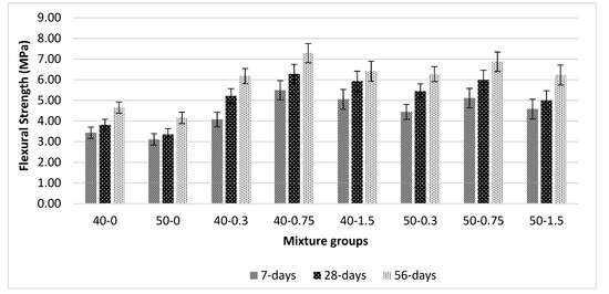Figure 8 shows the flexural strength (FS) values for basalt-reinforced bottom ash cement paste composites at 7, 28, and 56 days of curing. The same trend as observed in compressive strength was reported here. The addition of basalt fibers densified the matrix and better bonds were formed. The addition of basalt fiber seems to be effective until 0.75% volume fraction; beyond this value, a decrease in FS was reported. The loss of bridging effect and weakening of the matrix bonds between the cement pastes results in difficulty in compaction at higher rates and decrease in FS. Additionally, the addition of basalt fiber affects the fluidity of the composites and thus decreases the workability and FS at all curing ages. When considering the FS values, basalt fiber is more effective in 50-0.75 mixture groups compared with 40-0.75 mixtures at all curing ages. The improvement in FS was calculated as 65% and 57% for 50-0.75 and 40-0.75 mixture groups, respectively. The rate of increase in FS values was slightly lower (i.e., approximately 30%) for both mixture groups composed of no basalt fiber at the curing period between 7 and 56 days. At all volume fractions, both mixtures showed an increase compared with that of composites without fibers. The highest improvements were reported at 0.75% basalt mixture groups. At all additional levels, FS values tend to increase. The increase in FS values showed that a good bond exists between basalt fiber and cement paste. Another reason why there is no reduction in FS values beyond 0.75% may be due to the fact that the higher amount of basalt fibers is closely spaced with each other. Another effect may be due to the increasing amount of hydration products, which form better bonding with the basalt fiber. Additionally, at higher volume fraction, there are many fibers to bridge the action. Since basalt fiber is composed of silica and calcium oxide, it is expected to show better mechanical performance. The formation of calcium silicate hydrate gel leads to a higher compressive and flexural strength. Additionally, basalt fibers are in the form of an amorphous structure. This can help with the formation of a densified matrix with homogenous dispersion of basalt fiber in the cement paste. Saloni et al. [48] reported that basalt fiber acts as an aggregate and forms strong matrix properties, thus improving the strength. Similar results can be found in [44,45,46,48,50,51].