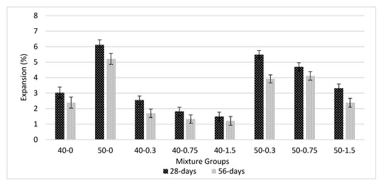 Figure 9 shows a sulfate-resistance test for basalt-reinforced bottom ash cement paste composites at 28 and 56 days of curing. Interestingly, sulfate-resistance improves with the addition of basalt fiber for all volume fractions. Actually, the resistance is governed by pore structure and amount of fiber. The addition of basalt fiber improves the bonding cement paste composites. The basalt fiber bridging mechanisms hold the matrix together and do not allow for weakening of the bonds. The rate of expansion decreases with increasing the amount of basalt fiber for both mixture groups. The average reduction of expansion due to the addition of basalt fiber was 30% for all mixture groups. The improvement might be due to the densification of the matrix and increments in FS values. This proves that sulfate ions did not result in adverse effects on basalt fiber. The increase in the bottom ash amount decreases the resistance to sulfate. Using 0.75% basalt fiber showed 44% less expansion at 28 days in the 40-0.75 series and 21% for the 50-0.75 series. When considering the same groups, if basalt fiber increased to 1.5%, those values were calculated as 51% and 46%. However, comparing the mechanical performance using basalt fiber beyond 0.75% reduces the compressive and flexural strength values. Similar conclusions can be found in [46,52].