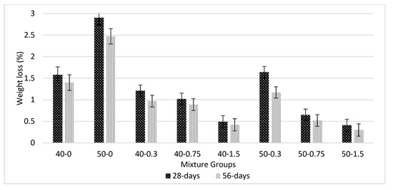 Figure 10 shows the seawater-resistance test for basalt-reinforced bottom ash cement paste composites at 28 and 56 days of curing. The addition of basalt fiber decreases the weight loss by seawater and improves the chemical resistance of the composites. Negligible weight loss due to seawater was recorded for both mixtures and curing ages. The resistance becomes higher at later ages with the help of basalt fiber. The second control mixture group (50-0 series) has higher weight loss by seawater. However, the addition of basalt fiber diminishes this increase. The reason is mostly due to the addition of basalt fiber, which blocks the open-pore channels and connectivity of the pores and thus reduces the diffusion of ions into the composites. The 50-1.5 series is more resistant to sea attack compared with 40-1.5 mixture groups; the 40-1.5 mixture series showed 70% improvement at 56 days, and this value was increased to 88% for 50-1.5 mixtures series at the same curing period when compared with the without basalt fiber mixture groups. When considering the 40-0.75 mixture groups, the improvement was limited to 36% at 56 days. However, this was 79% for 50-0.75. There is little information available about the chemical stability of composites composed of basalt fiber [46,47,52].