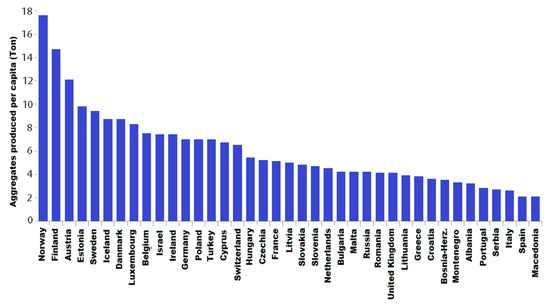 Global quarry practices to obtain coarse aggregates have substantially modified the ecological equilibrium. Figure 1 shows the amount, in tonnes of aggregates produced per capita in 39 countries. For the sustainable future of our planet, it is essential to find substitutes for virgin materials to harvest for producing binder and aggregates necessitated by the construction industry. Meanwhile, a lot of EOL materials are disposed of in open fields as landfill. One example of this kind of waste is construction and demolition debris with enormous potential for recycling as a profitable recycled concrete aggregate (RA) [2,3].