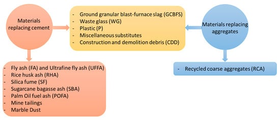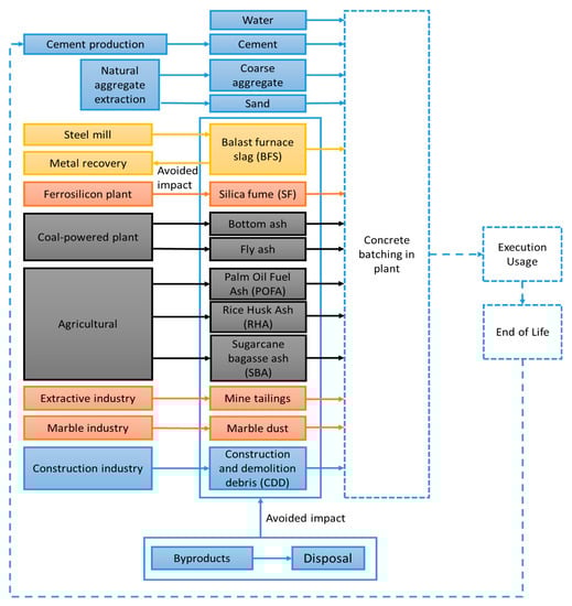 In addition, concrete has been produced with traditional supplementary cementitious materials (SCMs) that possess a high pozzolanic activity [10], such as fly ash (FA) [11,12,13,14], silica fume (SF) [15,16,17] and ground granulated blast slag (GGBS) [2,18,19,20,21] that yielded notable improvement in strength and durability. Numerous industrial solid by-products containing calcareous siliceous, and aluminous materials (fly ash, ultrafine fly ash, silica fume, etc.), along with some natural pozzolanic materials [22] (volcanic tuffs, diatomaceous earth, sugarcane bagasse ash, palm oil fuel ash, rice husk ash, mine tailings, etc.) can be used as SCMs, because they possess cementitious and/or pozzolanic properties [23]. The abundance of these classes of materials and their broad diversity in chemical and physical composition compel the development of a common strategy for their application in concrete production industry (see Figure 2) [24,25].