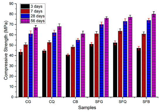 A study by Seong Soo Kim et al. [66] demonstrated the improvement in compressive strength due to SF incorporation. Three types of coarse aggregates (basalt, quartzite and granite) were used to produce different concrete samples. The main binder used was OPC (according to ASTM C150), while SF was used to substitute 10 wt. % of cement. Figure 3, from this study, demonstrates the increase in compressive strength increased for all coarse aggregates types (i.e., basalt, quartzite and granite), when SF was added (see Figure 3).