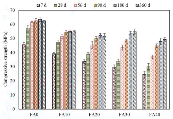 Ashish Kumer Saha [75] studied the use of Class F fly ash as a partial substitute of binder in concrete. A set of five samples was cast—a control sample without FA and 4 samples consist of 10, 20, 30 and 40% of FA as a substitute for cement. The water-to-cement ratio and the volume of superplasticizer were maintained constant for all 5 samples. The compressive strength (see Figure 6) of the FA mixtures showed lower early compressive strength than the ones of the control samples. The positive influence of FA additions could be observed at the longer hydration times, i.e., longer than 28 days of hydration. The small sized FA particles with high surface area and high percentage of amorphous silica phase provided the pozzolanic activity, leading to enhanced strength for longer periods of hydration. In addition, the spherical shape of FA particles improves the fresh state properties by increasing the workability of the concrete mix.