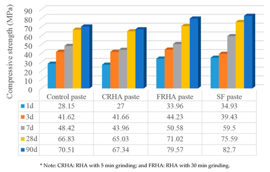 Weiting Xu et al. [83] compared the pozzolanic impact of SF and ground RHA as SCMs on the properties of composite cement pastes and concretes. The authors evaluated mechanical property, workability, durability and microstructure. In the composite cement pastes, the binder (OPC) was substituted with SF and finely ground RHA (named FRHA) at 5%, 10%, 15%, 20%, 25% and 30%, respectively by mass. They reported that the optimal substitution percentage of SF and RHA were 10% by weight of cement in pastes and concretes. Compressive strength for this composition was evaluated (see Figure 8) [83].