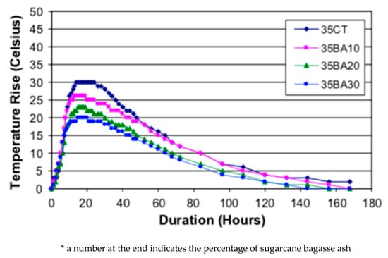 Use of SBA as limited cement substitute reduces hydration heat, compared to that of the control reference. The decrease of semi-adiabatic temperature rise (°C) is proportional to the percentage of SBA replaced (see Figure 11). Therefore, SBA may be used to control the temperature in mass concrete pouring [82].