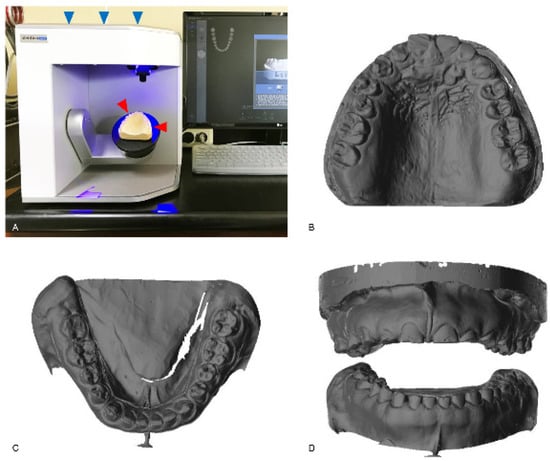 The indirect method for data acquisition. A conventional gypsum model (red arrowheads) is scanned with a model scanner (blue arrowheads; Identica hybrid, Medit, Seoul, Korea) (A). The scanned image data of the maxilla (B) and the mandible (C) are shown. The frontal view of the scanned data for both arches is also shown (D).
