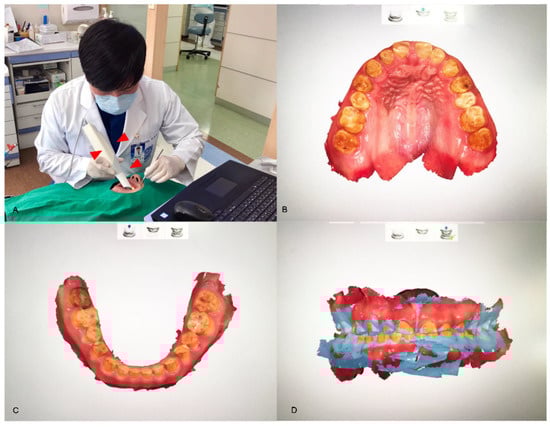 The direct method for data acquisition. An intraoral scanner (red arrowheads; TRIOS, 3Shape, Copenhagen, Denmark) converts the analog information of a patient’s mouth into digital data (A). The directly scanned data of the maxilla (B) and the mandible (C) are shown. The articulations between the arches are able to be digitally handled, depending on the jaw relation of the patient (D).