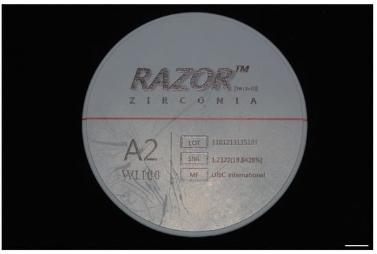 A disc-shaped zirconia block (Razor, U&C International Co., Ltd., Seoul, Korea). This block is partially sintered and 98 mm in diameter, and is available for a full arch implant-supported restoration. Bar = 1 cm.