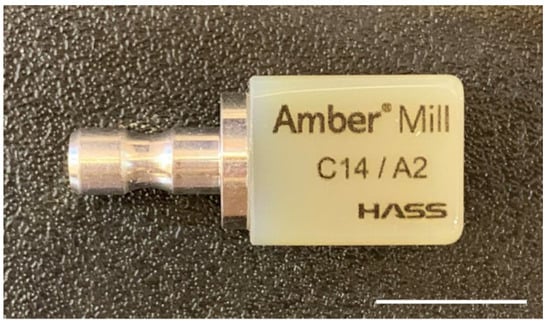 A bar-shaped lithium disilicate block (Amber Mill, HASS Co., Gangneung, Korea). This rectangular block is 14 mm in height, and is available for single restorations. Bar = 1 cm.