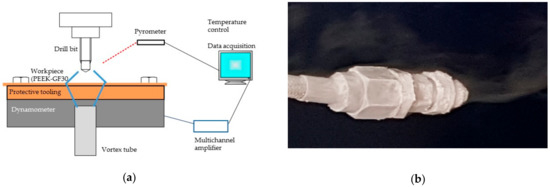 Machining process and data collection: (a) Scheme of assembly to drilling process and data capture; (b) Outlet of cold fluid after 8 minutes, with ice in the exterior.