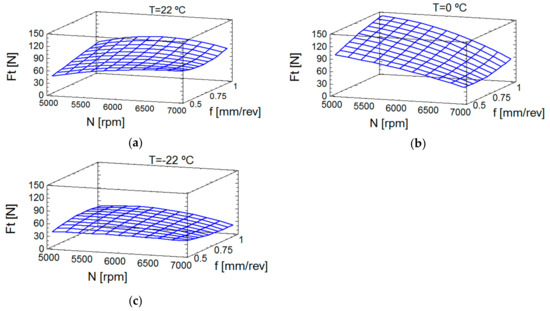 The effect of the temperature on thrust forces can be seen in Figure 4. The influence of spindle speed and the feedrate was lower at room temperature (Figure 4a) than at 0 °C (Figure 4b). Finally, it is remarkable that, at −22 °C (Figure 4c), the thrust forces were lower and less dependent of cutting conditions and the lowest values were reached. Figure 4 plots the values of Equation (6), also, the evolution of Ft and its trend, with continuous values. The evolution of forces at 0 °C deserves special mention, that showed the force decreased with the increase of spindle speed; the friction seemed to increase at this temperature, though this effect was diminished at higher spindle speeds; in this case, the feedrate more convenient is the lowest value. However, at −22 °C, the friction phenomenon did not seem to be affected, which could be explained because of greater influence of the air pressure at low temperature. Note that, as mentioned in Section 1, PEEK-GF30 maintains a stable behavior at low temperatures [14], which is very important because it prevents the modification of the material properties at these temperatures.