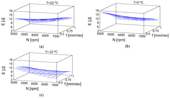 The estimation of response surface for energy can be seen in Figure 5. At 22 °C (Figure 5a) and 0 °C (Figure 5b) the distribution of the energy obtained was more uniform. At −22 °C (Figure 5c), the highest spindle speeds provided a similar behavior to that in thrust forces at this temperature, despite the greater influence of the torque in the calculation of the energy consumed during drilling [16]. The explanation can be the same as found for the forces, given the dependence of the cutting conditions along the cutting length during drilling (see Equation (1)). To clarify this point, in Figure 5 the values of Equation (7), the evolution of energy and its trend are plotted. Dry machining (at 22 °C) is an option with more energy consumption, maybe because there is a heating in the cutting area.