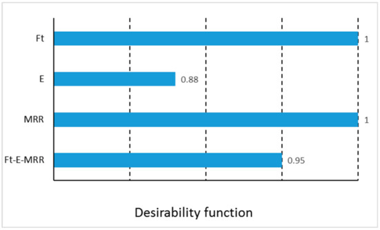 Figure 7 shows the values of desirability function for thrust force, energy, MRR and Ft-E-MRR; while that the maximum value (1) was achieved for thrust forces and MRR, the minimum value was for the energy, that obviously it was noted in the final value for the combined variable Ft-E-MRR. While with Ft and MRR, the maximum desirability was achieved, the energy showed a value of 0.88. This value can be considered normal due to the dependence of different variables on its calculation (see Equation (1)).