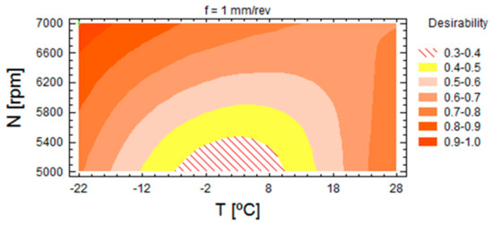 The optimization allowed finding the maximum desirability at −22 °C, feed of 1 mm/rev and 7000 rpm; under these conditions, the optimum values were 22.93 N for thrust force, 4.2 J for energy and 3298 mm3/s for MRR. Figure 8 shows the contours of estimated response surface. From this graphic it can be observed that the area of major desirability was located at a temperature of −22 °C and at high spindle speed, considering the thrust force, the energy and the MRR. Note that the optimal parameters allowed machining at high cutting conditions at −22 °C. This possibility can increase the potential use of machining at low temperatures by avoiding thermal expansion of the matrix of composite materials. This balance combines objectives of sustainability and efficiency.