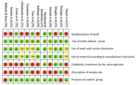 The title and abstracts of all articles identified by the electronic search were read and assessed by two authors (S.P. and F.A.). Disagreements between the reviewers were resolved by consensus with all the authors. The methodological quality of all selected full-text articles was assessed using the guidelines reported previously [1,24]. The description of the parameters for quality assessment was: randomization of teeth, use of teeth free of caries or restoration, use of materials according to the manufacturer’s instructions, use of tooth roots with similar dimensions, endodontic treatment performed by the same operator, description of sample-size calculation, and blinding of the operator of the testing machine. If the parameter was mentioned in the article, a “positive” (+) sign was assigned to that specific parameter; if the information was not provided, the article received a “negative” (−). The searched articles that reported one to three parameters were classified as having a high risk of bias, four or five items as medium risk of bias, and six or seven items as low risk of bias.