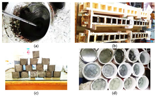 Mixing process. (a) Mortar mixing; (b) Wooden forms; (c) Demolded mortar samples; (d) Mortar specimens curing.