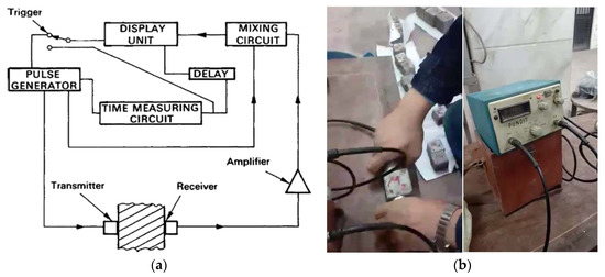 Ultrasonic pulse velocity (UPV) testing process. (a) UPV circuit components [35]; (b) UPV applying direct method.