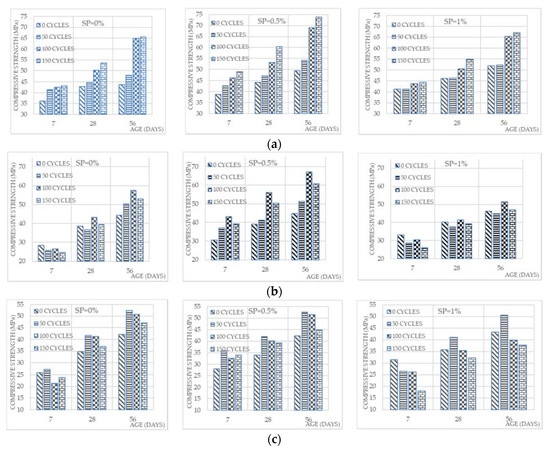 As shown in Figure 6, regardless of the percentage of SP and FA, the 56-day mixtures indicate the highest compression strength values. The highest value of compressive strength ever was about 70 MPa obtained by crushing the mixture treated with 150 cycles incorporating no FA content and 0.5% of SP dosage at the age of 56 days. The explanation of what happened is that mixtures are strengthened by extending the curing age [1,2,3].