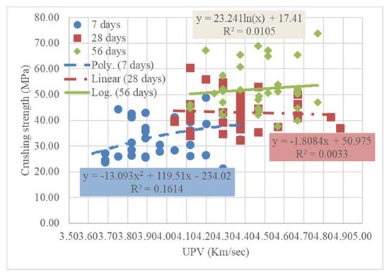 Figure 8 shows the results of the UPV values vs. the crunching compressive strength for 7, 28, and 56 days. In fact, the UPV results do not show a trend that could be followed or relied on as there was a slight difference in the results of the speeds compared to the large and wide difference in the values of the crushing strengths.
