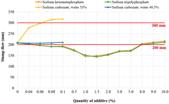 The last step of the treatment of clay soil Cl into a self-compacting grout was its liquefaction. This treatment step is especially important to achieve easy flow of the grout around the UU in the trench, without the need for vibration. In this case it is a completely new technology of soil treatment, which is not yet commonly used in current practice and is not very well known. Due to the clay mineral content of clay soil Cl, which is similar in composition to clays of ceramic slips, and based on laboratory testing of various types and quantities of liquefying additives. For the particular soil type (clay soil–‘Cl’), the following liquefying additives were selected for verification: sodium hexametaphosphate, sodium tripolyphosphate and sodium carbonate. These liquefying additives were verified in amounts of 0.04%, 0.06%, 0.08%, 0.1%, 0.5%, 1.5%, 2.5%, 3.5%, 5.0%, and 8.0% by weight of soil (see in Figure 2). When comparing the effect of plasticizers on soil liquefaction, it can be seen in Figure 2 that the sodium carbonate had the greatest effect on liquefaction (spillage value). This effect was apparent even if the small amount (0.04% of the soil) of the additive was added. The required spillage (200–300 mm) was achieved with a water content of 48.5%. By using this additive, it has been possible to reduce the amount of water for optimal spillage by 5%. This is why 0.1% of sodium carbonate for the design of self-compacting grouts was chosen as optimum.
