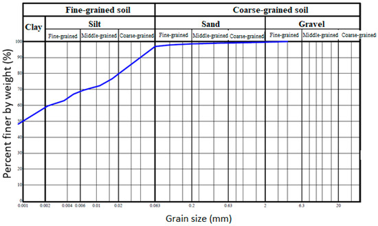 The main raw material for the design of self-compacting grouts was soil, which arises in the framework of UU excavation works. Due to the nature of soils and location, the Central European region (Brno, Czech Republic-CZ) was chosen for experimental activities. It is a typical locality in which there are almost all types of soil from limestones, clays, loesses, to sands [26]. The specific clay soil, marked ‘Cl’ according to classification in accordance with EN ISO 14688-1 [27], was taken from the Carpathian system, where Jurassic and Cretaceous sediments occur. Geologically, these are the so-called flysch parts, which are composed of sandstones to conglomerates with clay slates to claystones, i.e., layers with variable permeability and different strength character (Figure 1). The main parameter of the soil that is monitored with respect to the possibility of its reuse in excavation works is granulometry and mineralogical composition. The mineralogical composition was measured by X-ray diffraction analysis. The measurements of X-ray diffraction analysis were performed at diffraction angle 2θ within a range from 5° to 50° and with Cu Kα radiation. The quantity of the main mineralogical phases of the samples was determined with the Rietveld method and according to the internal standard CaF2. Other parameters determined for the soil were liquidity limit wL (54.00%), plasticity limit wp (29.90%), plasticity index Ip (24.10%), soil moisture w (25.40%), and degree of consistency Ic (1.19). Other parameters of the clay soil were measured according the standards EN ISO 14688-1 [27], EN ISO 15688 [28], EN 1997-2 [29], EN ISO/CD 20500-3 [30], and in particular EN ISO 15176 [31,32]. The results are described in Section 3.