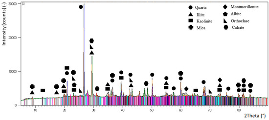 The main raw material was clay soil. For the identification of this material it was necessary to do its testing. In the following text are the results of the parameters of clay soil. The granulometry of clay soil Cl is shown by the granulation curve in Figure 3. From the granulation curve it was possible to read the proportions of the fractions of fine grain f (96.99%) with grains smaller than 0.063 mm, sandy fractions s (2.68%) with grains from 0.063 to 2 mm, and gravel fraction g (0.33%) with grains from 2 mm up to 60 mm. Based on the proportions of individual fractions, it was also possible to specify the soil name to F7 = MH. According to this designation, it was clay with high plasticity class F7. Based on X-ray diffraction analysis (Figure 4) it was found that the following types of minerals mainly occur in the soil: kaolinite, illite, micas, quartz, calcite and montmorillonite. Orthoclase and albite were also recorded in the soil.