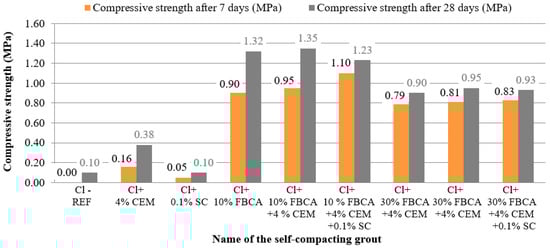 Based on a comparison of self-compacting grout of clay soil Cl and 4% cement (Cl + 4% CEM) with grouts containing 10% and 30% FBCA and additionally containing 4% cement, it can be stated that by increasing the cement dose, the compressive strength values still increased. With the addition of 10% FBCA and 4% cement to clay soil Cl (Cl + 10% FBCA + 4% CEM), a compressive strength of 0.95 MPa after seven days of maturation and 1.35 MPa after 28 days of maturation was achieved. On the other hand, a decrease in compressive strength was observed with the addition of 30% fluid fly ash and 4% cement to clay soil Cl (Cl + 30% FBCA + 4% CEM). Based on the results achieved, it can be stated that the development of compressive strength of self-compacting grouts was influenced both by the addition of FBCA (mainly in the amount up to 10% of the weight of the soil) and by the addition of 4% cement CEM II/BM (S-LL) 32.5 R.