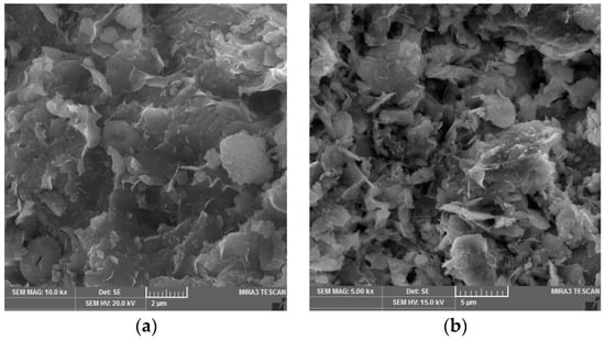 (a) SEM image of the self-compacting grout based on clay soil Cl, 4% CEM and 0.1% SC, (b) SEM image of the self-compacting grout based on clay soil Cl, 4% CEM, 10% FBCA, and 0.1% SC.