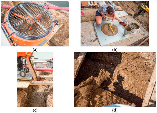 Initially, the clay soil Cl was mixed with cement and FBCA for five minutes. Subsequently, a small amount of water was added to the mixture. During intensive mixing, which took about five minutes, water was gradually added to the grout. The amount of water added to the grout was controlled by the optimum spillage value, which was verified by the Abrams cone slump-flow test with a measured spillage diameter of 680–700 mm (Figure 8b). After mixing, the grout was poured into the trench (Figure 8c). The grout was poured off directly into the trench (Figure 8d).