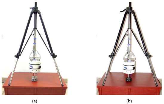 The authors of [19] indicate the possibility of using the “The PiScan Probe” device to measure dynamic properties of bituminous mixtures. It is composed of a modal impact hammer and two accelerometers with weights ensuring adequate pressure of the accelerometers to the wearing course, which may be at a distance of 15 cm or 30 cm during the tests. The accelerometers are connected to each other by a special frame. During the tests, the distance between the point of impact with the modal hammer and the first and second accelerometer was 30 cm each (SAWS test). In the case of resonance tests, modal impact hammer strikes were carried out at a distance of 7.5 cm from the accelerometer mounting point (MP1). Similar to the work in [18], the parameters of the modal hammer, accelerometers and data acquisition parameters used in the study are not given.