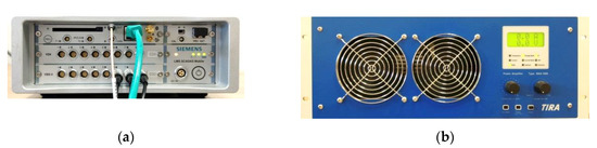 Multichannel 24-bit data acquisition hardware type SCADAS Recorder from SIEMENS (Plano, TX, USA) (a) and TIRA signal amplifier (b) (TIRA GmbH, Schalkau, Germany).