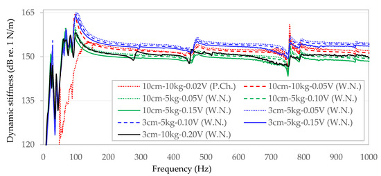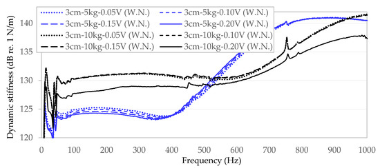 The results of measurements are shown in Figure 3. The values of dynamic stiffness on the vertical axis are expressed in N/m on the dB/Level scale (reference numerals used in the legend: 3 cm/10 cm—the diameter of the load plates; 5 kg/10 kg—the total static load of the specimens; 0.02−0.20 V—the signal amplification).